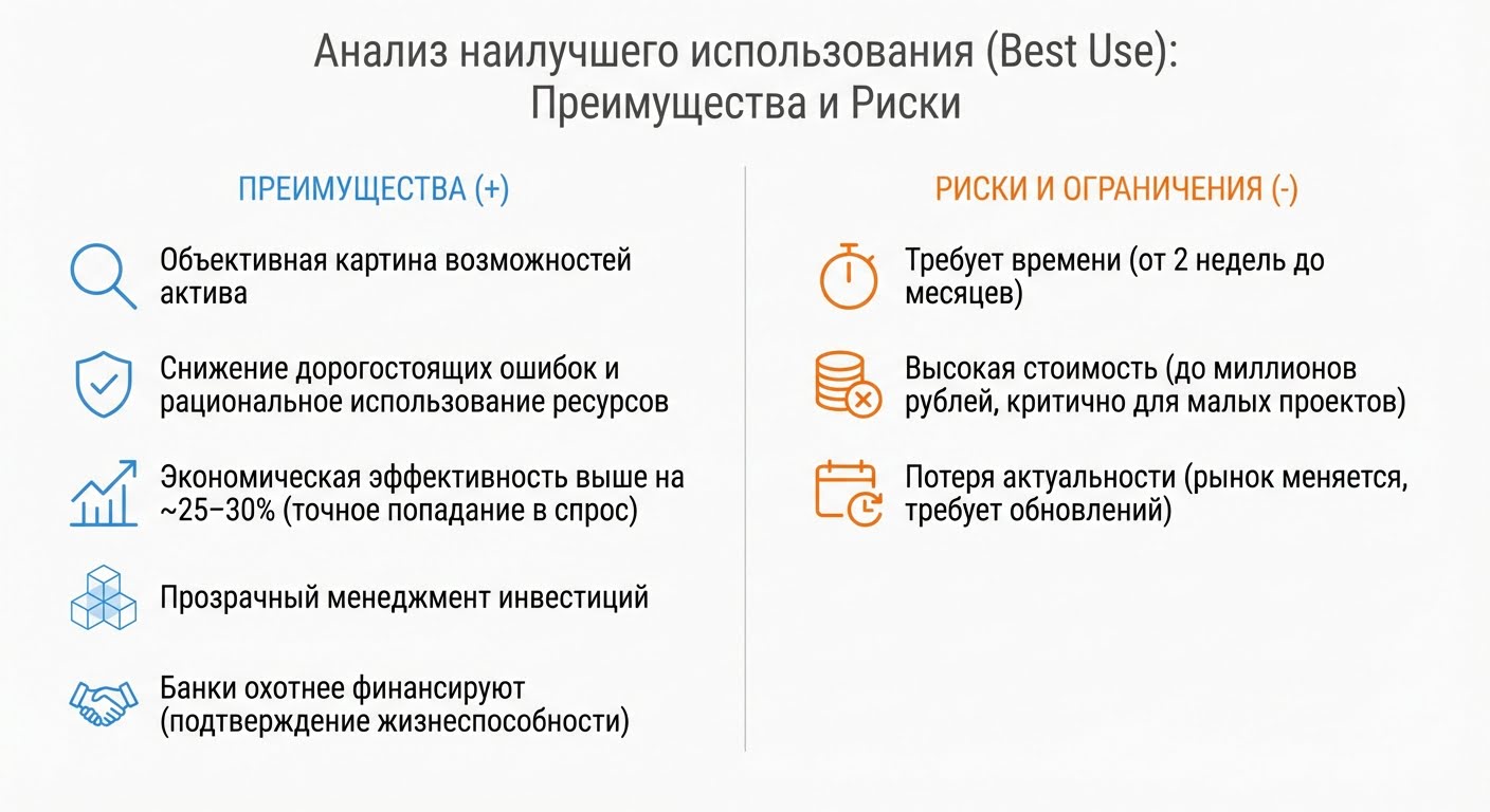 У профессионального анализа наилучшего использования есть очевидные плюсы. Собственник получает объективную картину возможностей своего актива. Методика снижает вероятность дорогостоящих ошибок и помогает использовать ресурсы рационально.