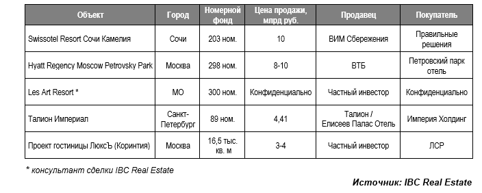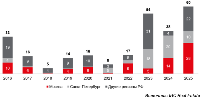 Согласно данным консалтинговой компании IBC Real Estate, совокупный объем инвестиций в сегмент гостиничной недвижимости в целом по России по итогам 2025 года достиг 60 млрд руб., что на 57% превышает показатель 2024 года (38 млрд руб.), а также превосходит значение 2023 года (54 млрд руб.), которое ранее считалось рекордным. Новый максимум обеспечен закрытием целого ряда знаковых для рынка сделок – продажи Swissotel Resort Камелия в Сочи, Hyatt Regency Moscow Petrovsky Park в Москве, загородного отеля LesArt Resort в Московской области, а также проекта реконструкции здания бывшей гостиницы «ЛюксЪ» на Тверской улице.