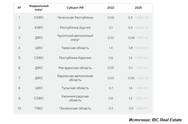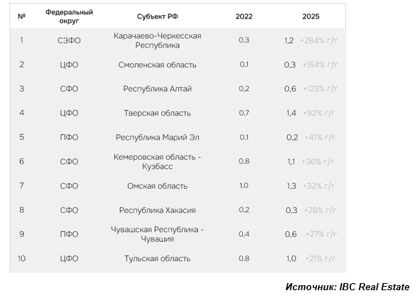 ТОП-10 регионов РФ по приросту номерного фонда в сравнении 2022 к 2025 году,