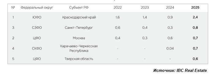 Большая часть (30%) нового строительства в России пришлось в 2025 году на Краснодарский край. Этот регион высоко востребован российскими гражданами для отдыха, что обусловлено сложностями выездного туризма, благоприятными климатическими условиями и выгодным географическим положением с выходом к Черноморскому побережью. Так, по данным Росстат, в Краснодарском крае численность гостей в коллективных средствах размещения с января по сентябрь 2025 года составила 7,3 млн человек.