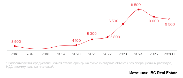 Средневзвешенная запрашиваемая ставка аренды сухих существующих складов класса А (без операционных расходов, НДС и коммунальных платежей) к концу 2025 года составила 10 000 руб./кв. м в год, что на 13% ниже показателя на конец 2024 года. Снижению ставок способствовали рост вакантного предложения и сдержанный спрос. Кроме того, на их динамику оказал влияние эффект высокой базы, то есть их быстрый рост в предыдущие годы.