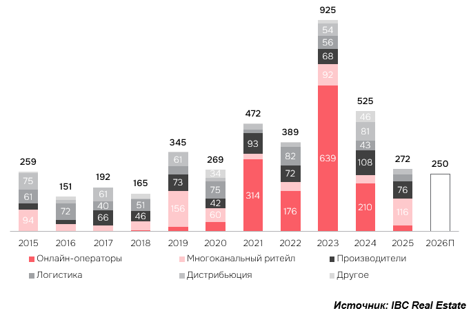 По данным консалтинговой компании IBC Real Estate, спрос на складскую недвижимость в России по итогам 2025 года составил 5,5 млн кв. м, что на 8% ниже результата 2024 года. Доля сделок со складской недвижимостью в Санкт-Петербурге и ЛО составила 5% от общего объема по стране или 272 тыс. кв. м. Это третье место по распределению спроса на складскую недвижимость среди регионов России.