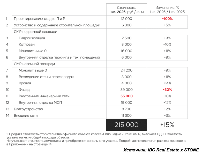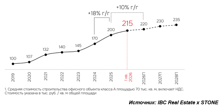 Согласно данным консалтинговой компании IBC Real Estate и аналитического центра STONE, стоимость строительства офисного объекта класса А по результатам I квартала 2026 года составила 215 тыс. руб./кв. м общей площади (с учетом НДС), при пересчете на полезную показатель достигает 380 тыс. руб./ кв. м, что на 15% выше г/г. В соответствии с прогнозом на 2026 индикатор продолжит свой рост и к концу года составит 220 тыс. руб./кв. м (+10% г/г) или 385 тыс. руб. / кв. м полезной площади, что характеризуется как стабилизация на фоне двух предыдущих лет стремительного роста – на 17% в 2024 и на 18% в 2025. Аналитики IBC Real Estate и STONE ожидают, что в 2027 и 2028 гг. темпы роста стоимости строительства составят 5% и 2% соответственно.